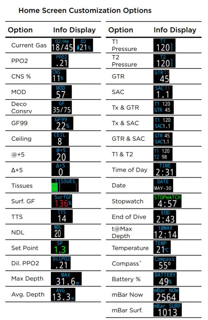 There are two different kinds of display options when in dive mode, Big and Standard. Big shows larger fonts but slightly less information at a glance. Standard has more customizable slots for information display but uses smaller fonts. You can also change the color of the fonts.