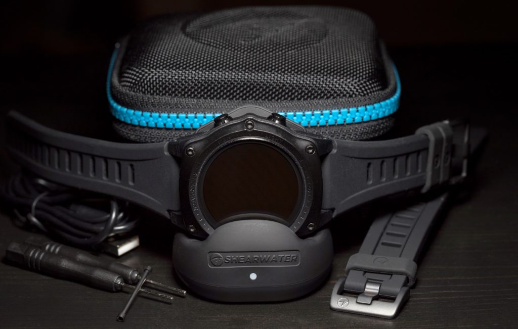 It comes with a black rubber strap, a strap extension (for use with bulky thermal protection such as drysuits), cable, wireless charger, additional strap bars and screwdrivers for changing the straps. All of this is packed in a nice travel case.